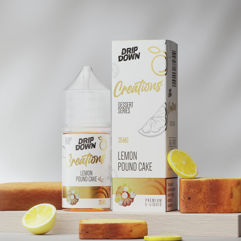 Lemon pound cake drip down creations dessert 30ml salt nicotine flavor captures the moist, dense texture of bakery cake on a subtle glaze profile.