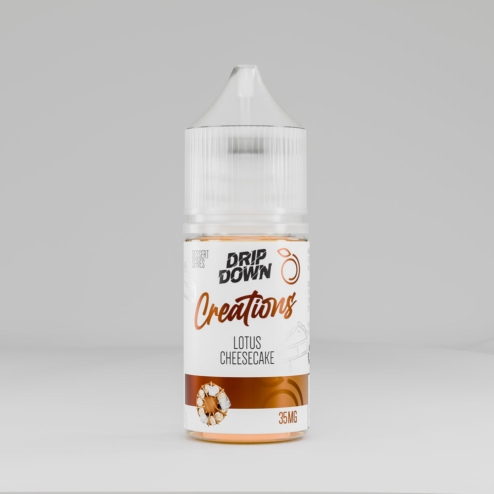 Lotus cheese cake drip down creations 30ml salt nicotine flavor each puff delivers biscuit sweetness on velvet smoothness of cheesecake, a hint of caramel glaze.